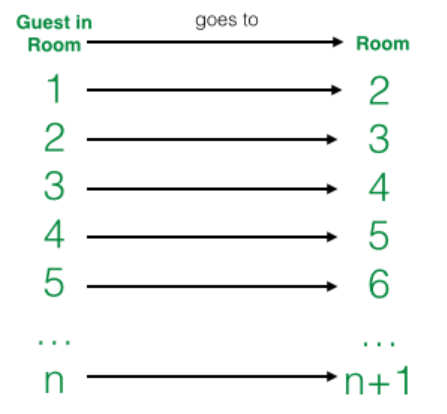 Suppose a new guest arrives and wishes to be accommodated in the hotel. We can (simultaneously) move the guest currently in room 1 to room 2, the guest currently in room 2 to room 3, and so on, moving every guest from his current room n to room n+1. After this, room 1 is empty and the new guest can be moved into that room. By repeating this procedure, it is possible to make room for any finite number of new guests.